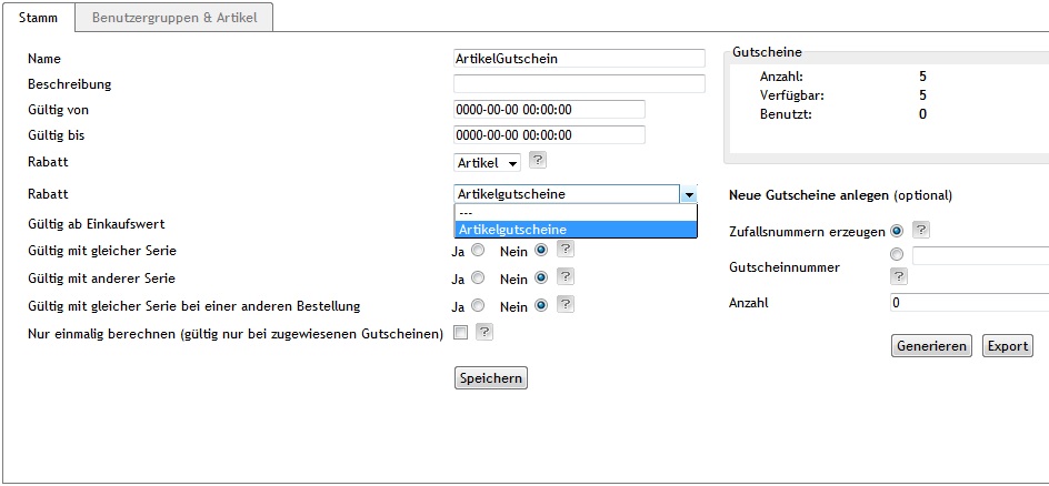 - Anpassen der Einstellungen wie Gültigskeitszeitraum, Gültig ab Einkaufswert, Gültig mit gleicher Serie etc setzen. Für den ersten Test dürfen diese Einstellungen auch gern etwas weniger eingeschränkt sein.